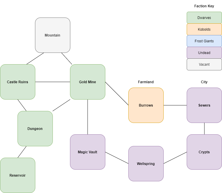 You can also see that I've marked which areas are under control of which factions to start out. Three large ones and one small one is pretty good. So wherever the players enter the dungeon from, they aren't just going to clear out that space and haul in all the riches. They'll be facing one piece of a larger network of allied forces. And while they could totally wipe their enemies out, they'll just as likely force a retreat to some other area. Plus, the factions are scheming against each other to expand their own territory in key areas, so the makeup of the megadungeon will change even without the players' involvement. Let's take a look at how this dungeon might transform after you throw some PCs at it.
